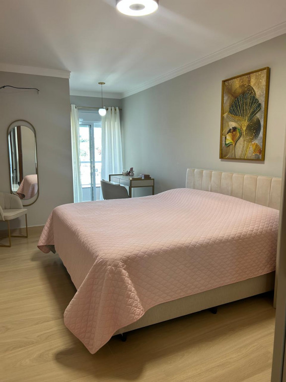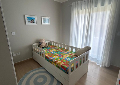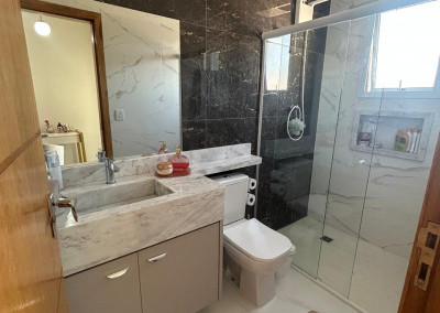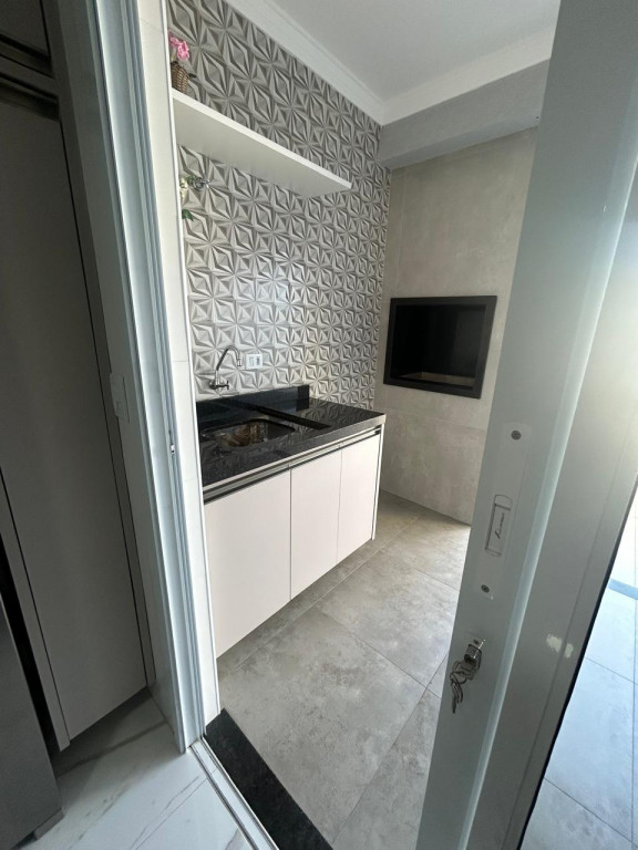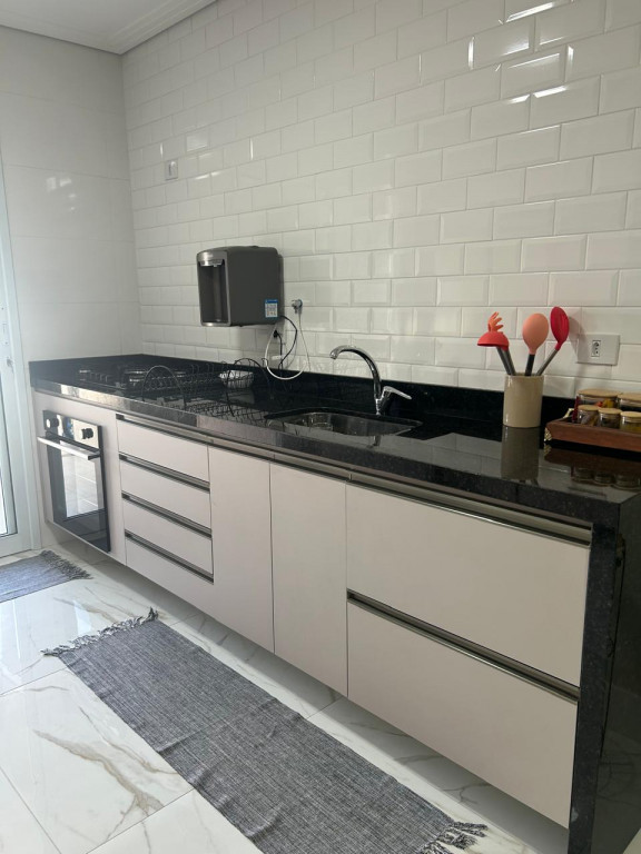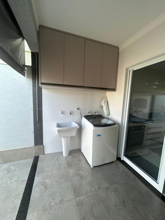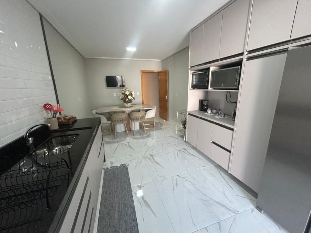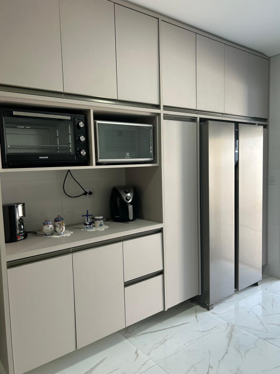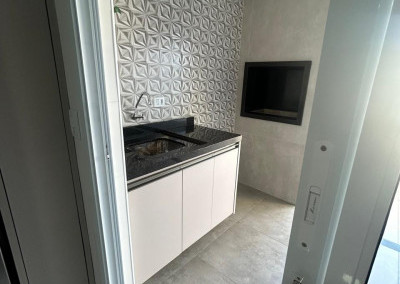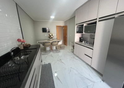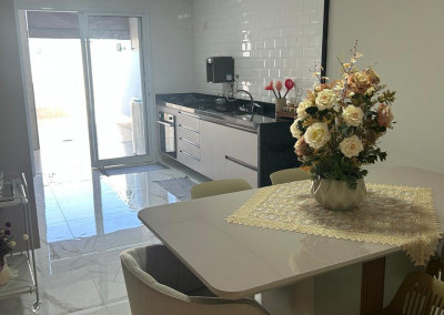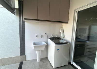 A cozinha é equipada com móveis planejados de qualidade, integrada a uma área gourmet com churrasqueira, perfeita para receber amigos e familiares. A área de serviço também possui armários, oferecendo mais organização e funcionalidade.